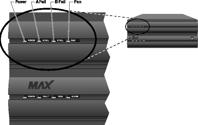 Before you start up the MAX, you need to understand the LEDs on the MAX. Figure 2-8 shows the location of LEDs on the front panel, Figure 2-9 shows the location of the LEDs on the redundant MAX front panel and Figure 2-10 shows the Ethernet interface LEDs on the MAX back panel.