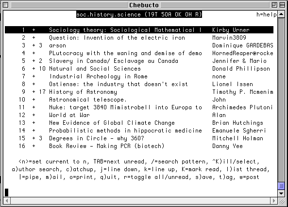 Once you have selected a particular group, for instance soc.history.science, you are then presented with a list of the posts which are currently there. They are listed in the chronological sequence in which they arrived at the site. You can see the title of the post as well as its author. The numeral to the left of the title tells you how many responses there have been to a particular post, and hence how many items there are in the 'thread'. When you select an individual item you can then read the post, reply to it, save the text, and so forth.